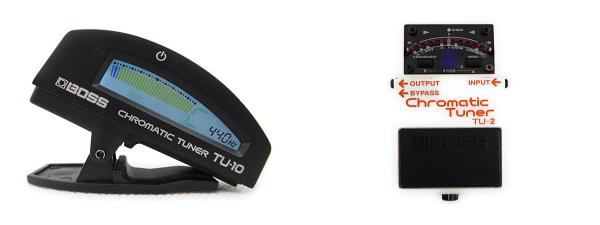 エレキギターだと振動が弱いため精度は下がりますので、エレキギターには右側のエフェクター型チューナーがおすすめです。