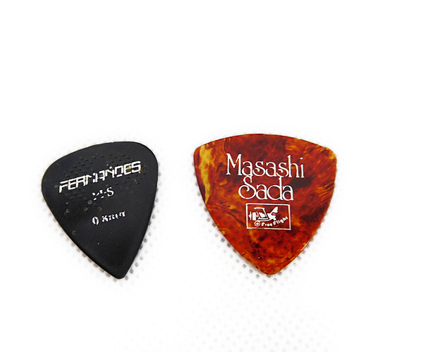 一般的なのは写真の2種類で、左のティアドロップ型は弦と接触する箇所の面積が小さいので、軽い力で弾けるのと一弦一弦弾き分けるリードプレイに適しています。