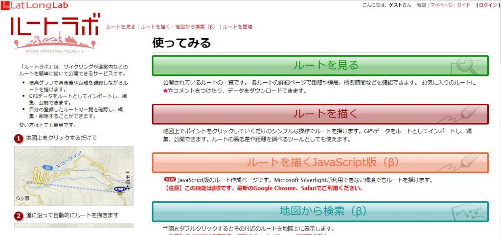 ルートラボは、オンラインの地図上でルートの作成や公開されたルートの閲覧などが行えるウェブサービスです。