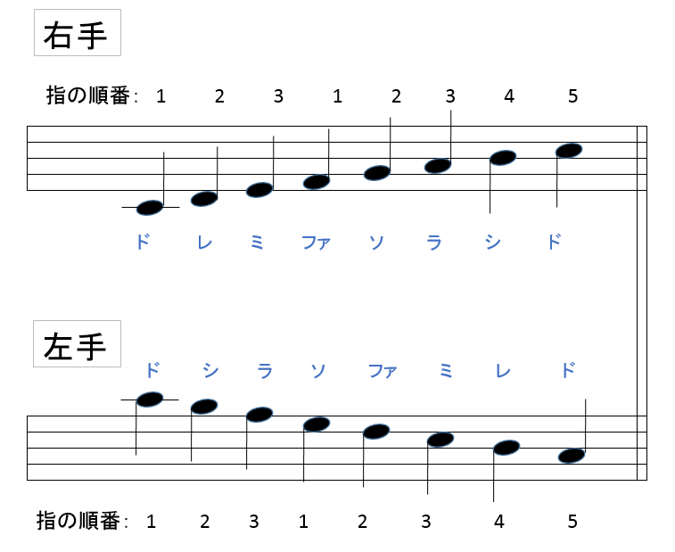 右手で指の順番を1、2、3(ドレミ)と動かしたら、親指を中指の下にくぐらせて、また1、2、3、4、5(ファソラシド)と動かしていきます。