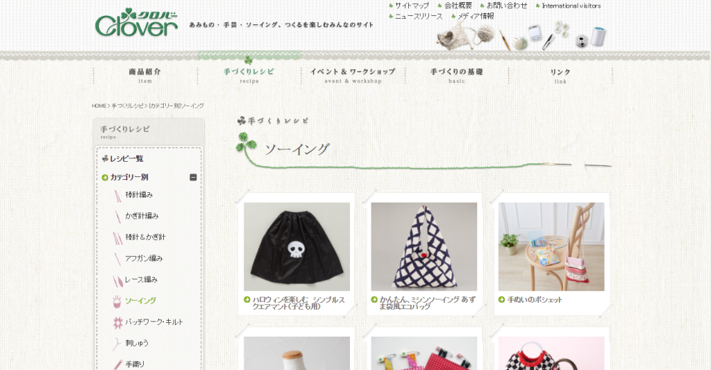 裁縫道具メーカーのクロバーでも、たくさんの手作りレシピを公開しています。手芸道具メーカーらしく、道具ごとにカテゴリー分けされています。