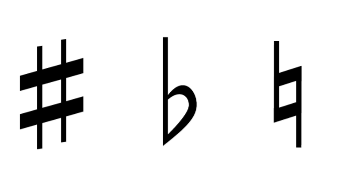 画像に示されいる記号は左から、シャープ、フラット、ナチュラルと呼び、楽譜を読む上で欠かせない記号です。
