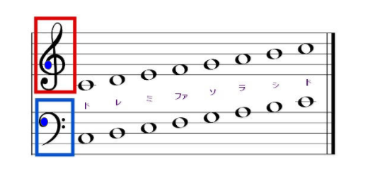 画像の赤色で囲っている部分を『ト音記号』、青色で囲っている部分を『ヘ音記号』と言います。