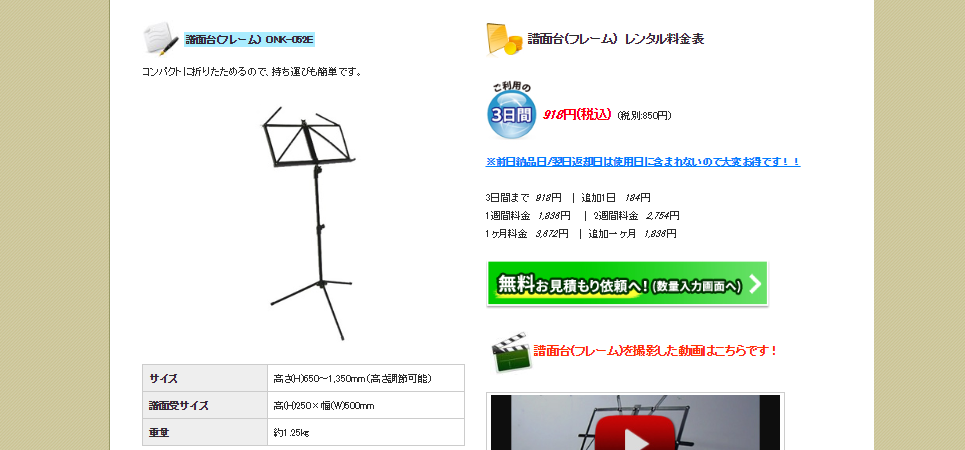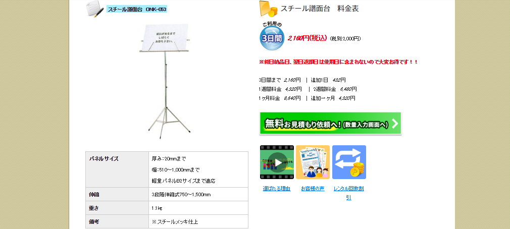 レンタル料金に加え、送料と返送料がかかるのがネックです。しかも、譜面台は奈良支店から全国に発送というように、発送元が限られています。