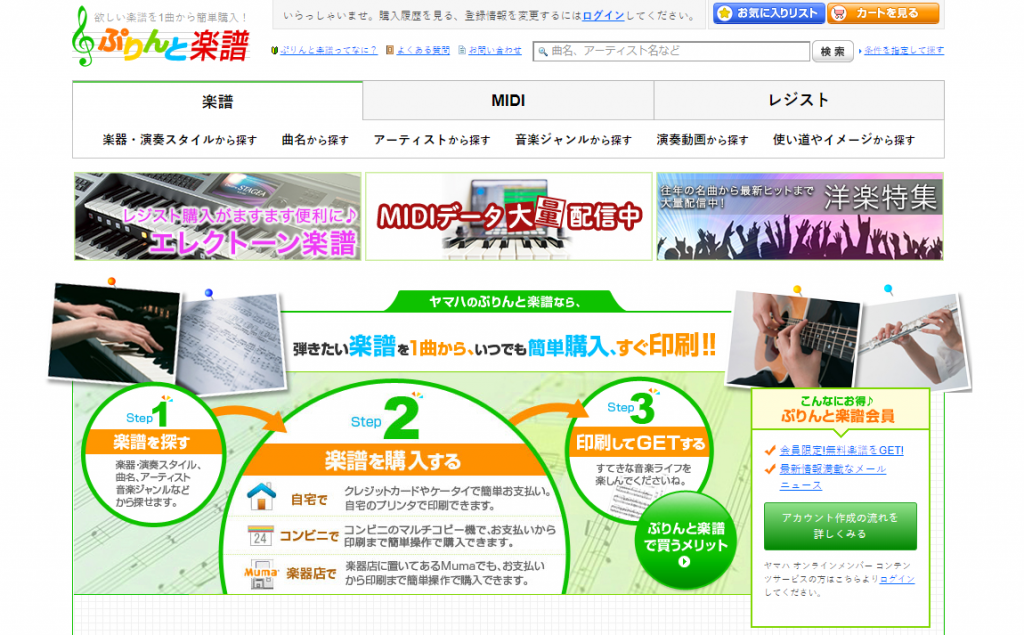 おすすめの楽譜ダウンロードサイトは、ヤマハが手がける楽譜ダウンロード販売サイトぷりんと楽譜。