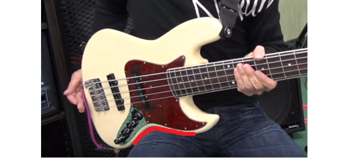 座ってベースの練習をする際は、ベースのボディのくぼんでいるあたりを、太ももの付け根の上に乗せると安定します。