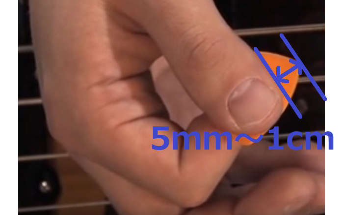 人差し指と親指でピックを挟んだら、挟んだ指から5mm~1cm程度ピックが出るように持ちます。