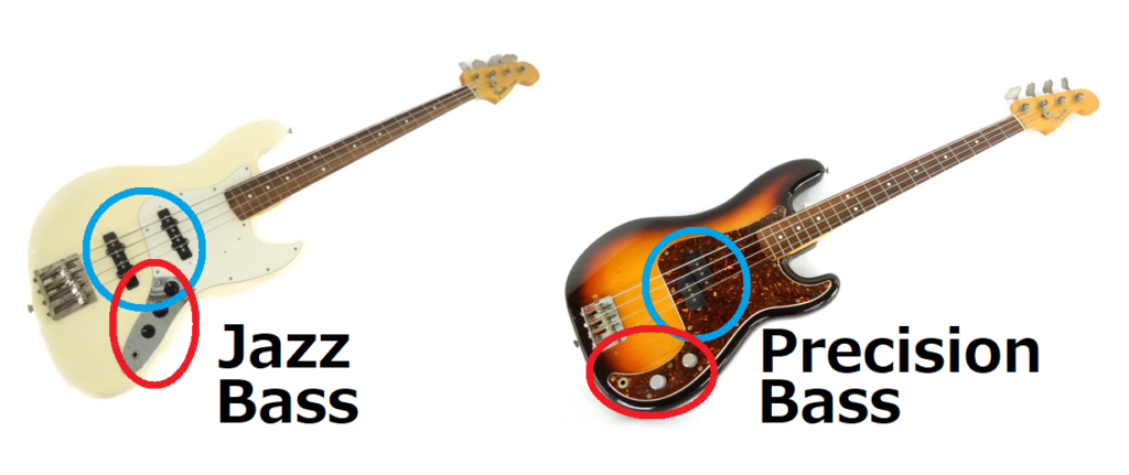 左のジャズベースは、青い丸で囲んだピックアップが離れて2つ付いています。対して右のプレシジョンベースは、ピックアップが2つ左右にずれて付いているのがわかるでしょう。
