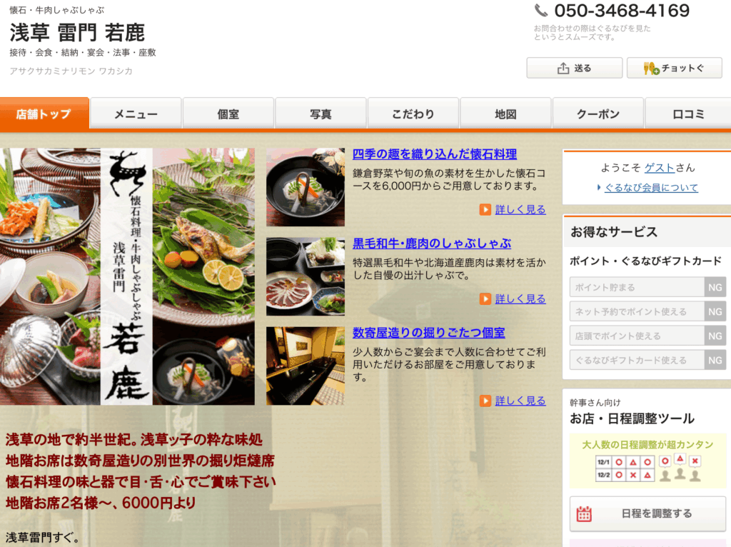 「浅草 雷門 若鹿」は、4~6名用の半個室と、5~12名での利用が可能な宴会用の個室、2種類の個室が用意されています。