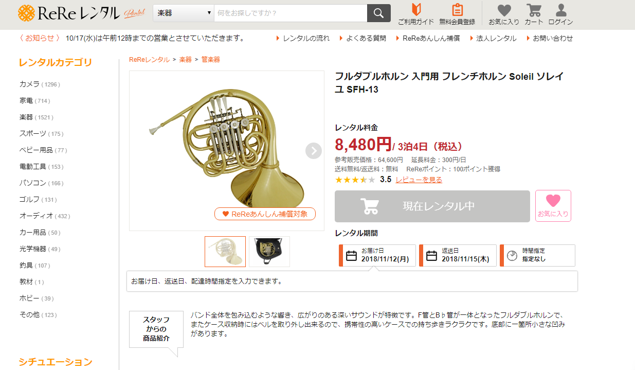 ReReレンタルでフレンチホルンソレイSFH-13をレンタル
