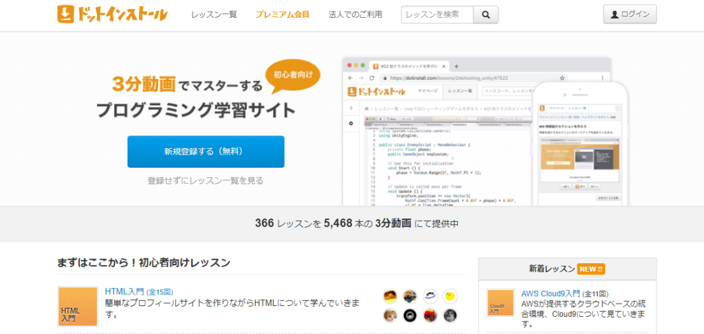 ドットインストールの利用料金体系は、 無料会員と月額980円のプレミアム会員の2種類がありますが、初心者でしたら、無料会員でも十分なレッスン内容となっています。