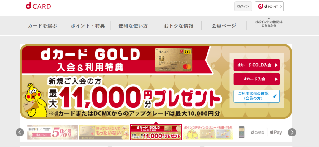 dカードGOLDは、docomoユーザーにおすすめのクレジットカードです。docomoユーザーの場合、通信費の料金に対して10%と破格のポイント還元を受けることができます。