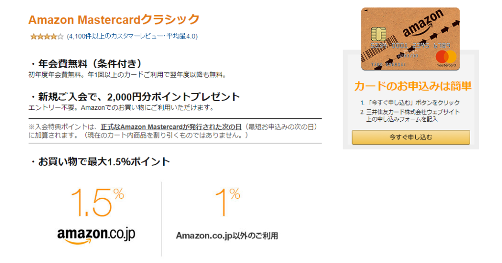 Amazonクレジットカードは、ポイント還元率が1%と高めに設定されています。