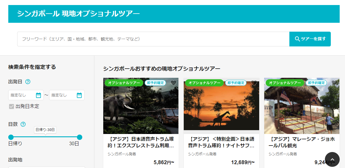 1. トップページの「海外旅行」→「現地オプショナルツアー」→「シンガポール」と順番に選択