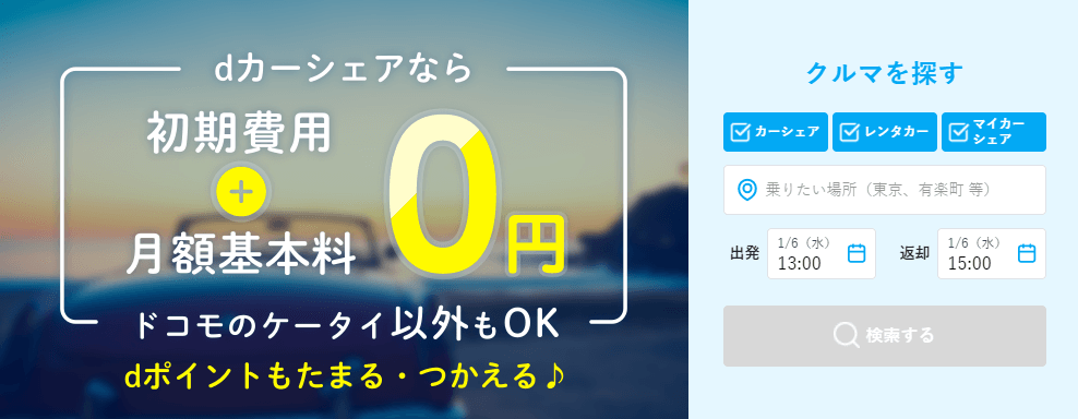 こういった場合に便利なのがdカーシェアです。レンタカー8社とカーシェア4社から比較して予約できるので、空車も見つけやすいと言えます。
