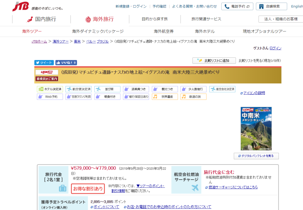 イグアスの滝・マチュピチュなどを巡る8日間のツアーです。成田空港初8日間の旅で、大人1名あたり280,000円~310,000円のツアーとなっています。