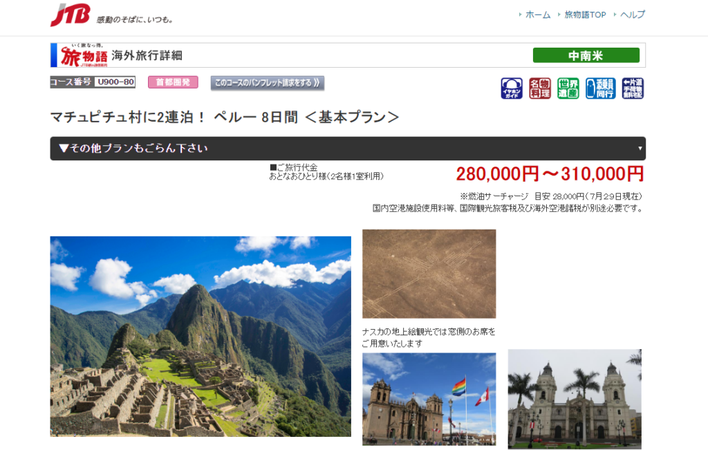 少々値ははりますが、空中都市と呼ばれる「マチュピチュ遺跡」や「ナスカの地上絵」といった世界遺産を満喫できる大満足のプランです。