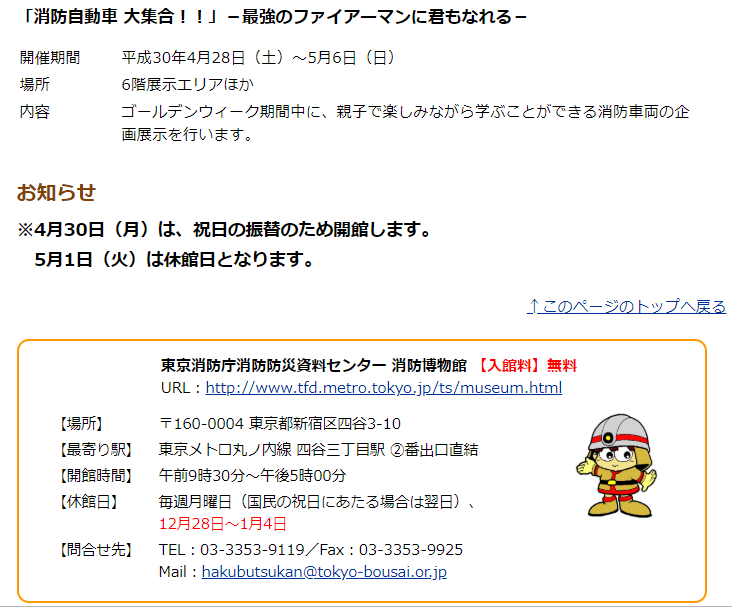 四谷三丁目にある消防博物館では昨年「消防自動車 大集合!!」-最強のファイアーマンに君もなれる-が入場無料で開催されました。働く車が好きなお子さんも多いと思いますが、そんなお子さんにおすすめなのがこの消防博物館。