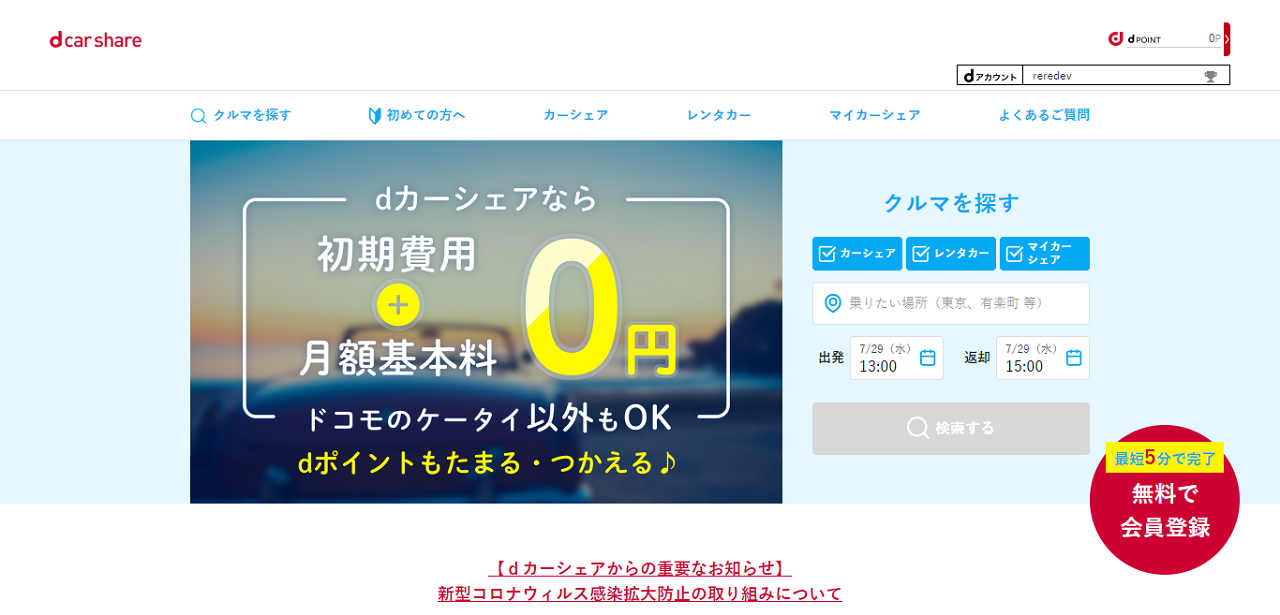dカーシェアは、月額料金無料で、様々な会社のカーシェアステーションが利用できます。