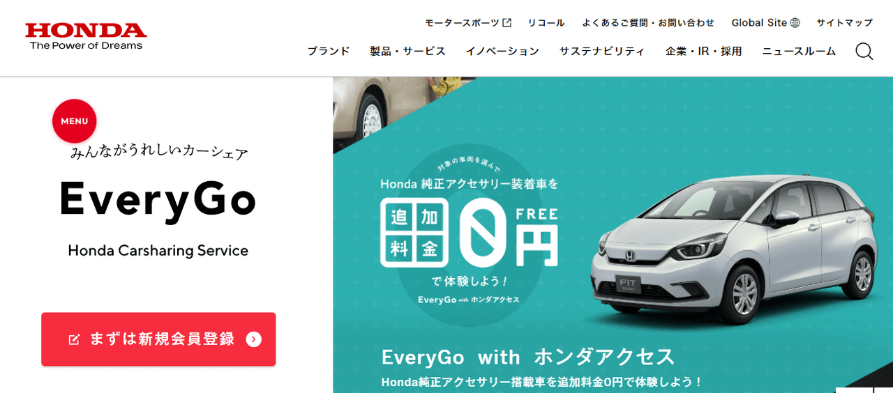 犬に優しいカーディーラーとして知られるホンダが運営する、カーシェアリングサービスのEveryGoでは、ペットを同乗してのご利用が可能です。