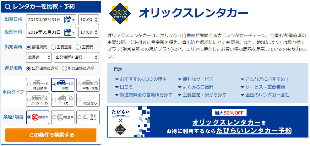 オリックスはトヨタレンタカーに次いで2番目の規模があり、顧客も多いのが特徴です。キャンペーンも豊富にあり「早予約」でかなりお得になるので、オリックスレンタカーのサイトをチェックしてみてください。また、カーナビは搭載されていますが、ETCはがついていない車種もあります。