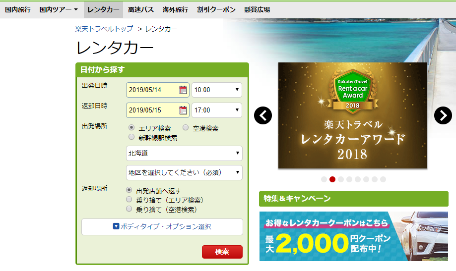 乗り捨てプランにも対応可能で、検索項目が非常に多いので、こだわってレンタカーを選びたい人に適しています。楽天トラベルを利用してレンタカーを借りると、楽天ポイントが貯まるのもうれしいメリットです。