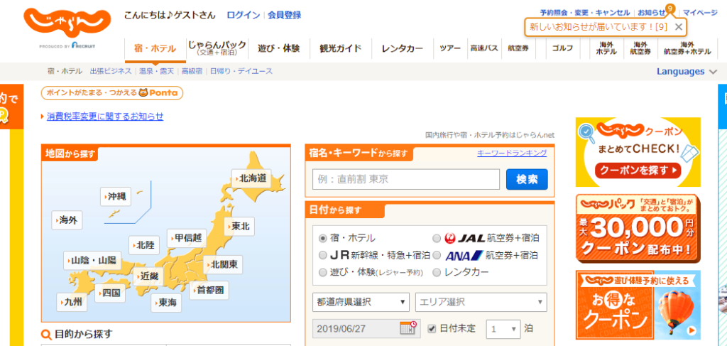 じゃらんや楽天トラベルなど、店舗を構えずにインターネット上で販売をしている旅行会社のことをOTA(オンライントラベルエージェント)といいます。様々なOTAが増えてきているのですが、中でもおすすめは「じゃらん」です。