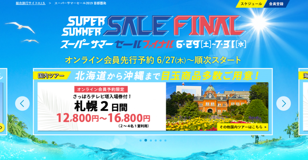 格安の航空券やツアー販売に定評がある、H.I.S.。特に、季節ごとに発売されるセール商品などは比較的料金が安くおすすめ。