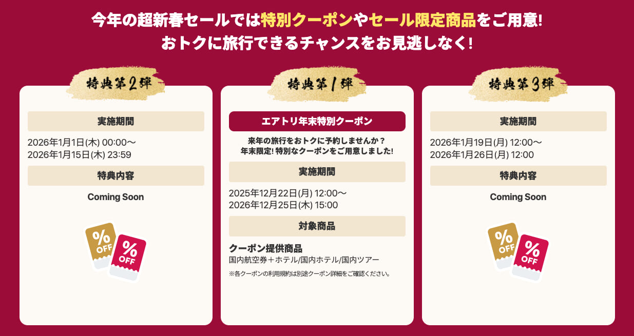 エアトリでは、年末から年始にかけて「超新春セール2026」を開催します。期間は2025年12月22日〜2026年2月3日までで、3段階に分かれて実施されます。