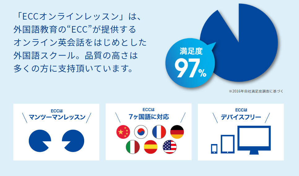 ECCオンラインレッスンは英会話教室のECCが提供するオンライン英会話です。なんと7カ国語を学ぶことができ、それぞれネイティブ講師からレッスンを受けることができます。