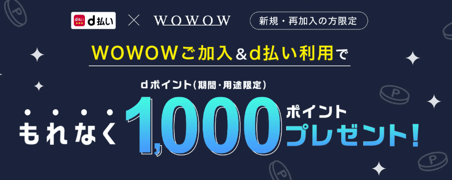 WOWOWに「新規加入・再加入&d払い利用」で、もれなく「dポイント1,000ポイント」がもらえます。