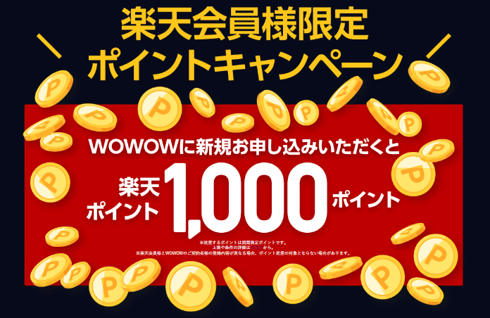 楽天では「楽天会員となりWOWOWに新規加入」することで、もれなく「楽天ポイント1,000ポイント」がもらえるキャンペーンを実施中です。