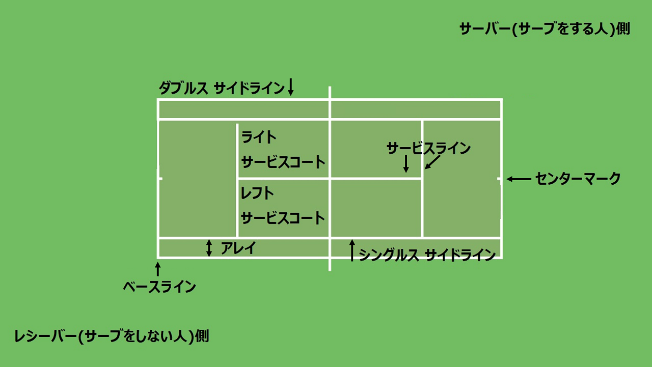 「サービスコート」はシングルスのサイドラインとサービスラインに囲まれているところを指します。先ほども説明したように、サーブは対角線上のサービスコート内に入らないといけません。