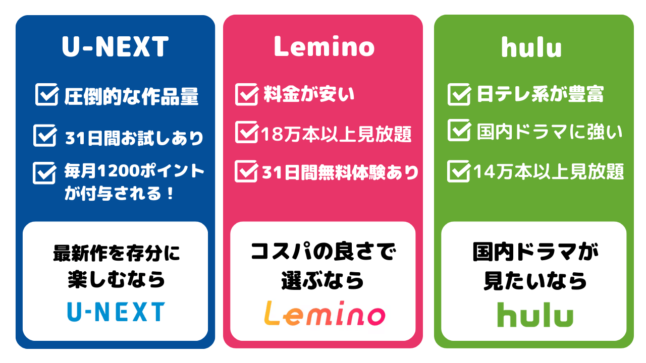 ここからは、ドラマ見放題サービスの選び方を3つ紹介します。迷ったらこの選定基準を思い出してくださいね!