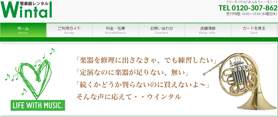 | 管楽器レンタルWintal | 最短1ヶ月~ | 1,980円(税込/1ヶ月) | 宅配or店頭受取 | 有料 | サイト内のオーダーフォームから注文or書面にて郵送 | 株式会社フジクラ楽器 |