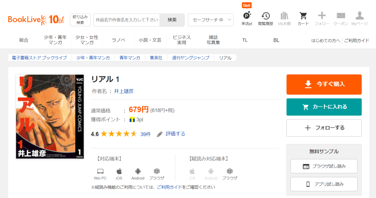 スラムダンクの作者 井上雄彦氏による異色の社会派バスケットボール漫画-リアル。第5回文化庁メディア芸術祭マンガ部門優秀賞受賞作品です。