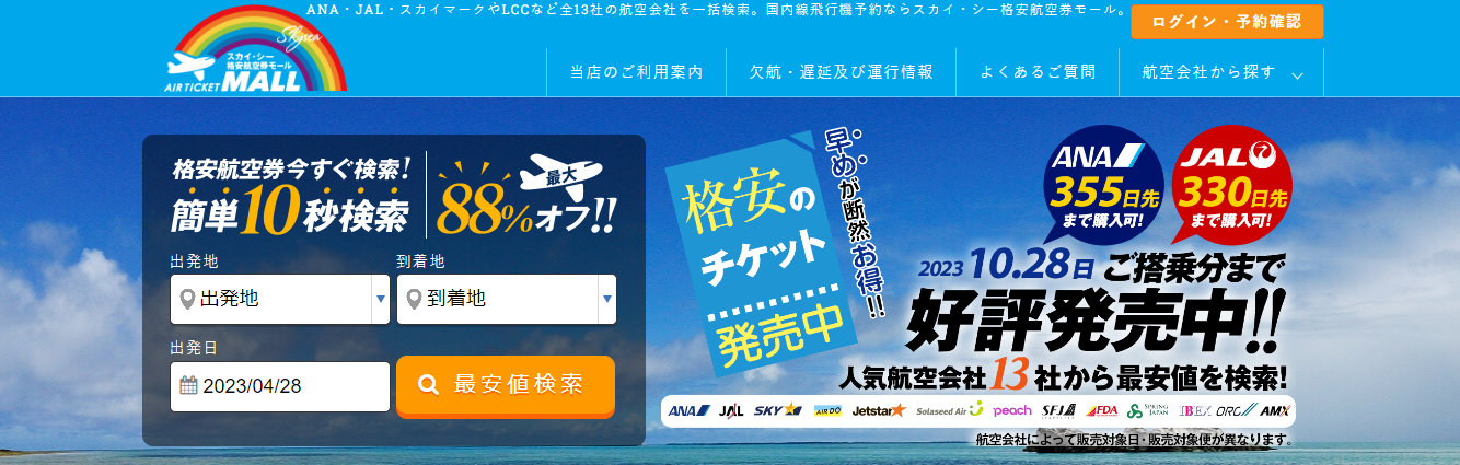 国内線でお探しの方は、「スカイシー格安航空券モール」もおすすめです。国内線のみではありますが、JAL/ANAをはじめ、LCCや熊本を拠点とする「天草エアライン」も取り扱っています。