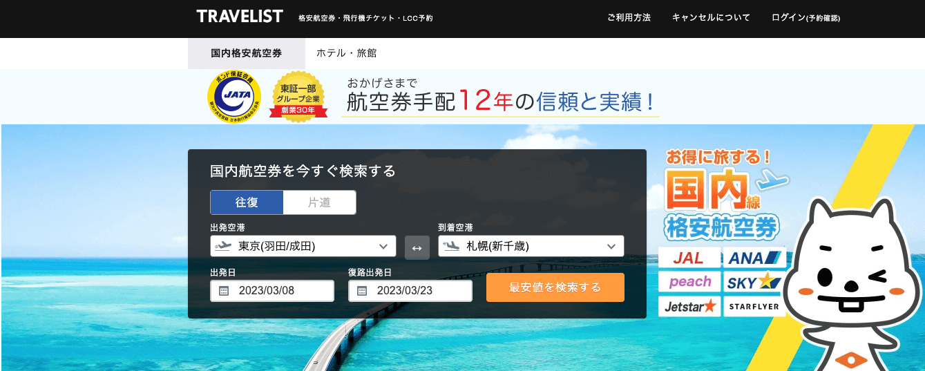 国内・海外の航空券・ホテルを検索できる「トラベリスト」では、JAL/ANAをはじめ、LCCも扱っています。