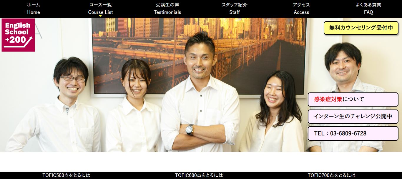 English School +200の講師は全員新形式のTOEICで満点を取っています。マンツーマンレッスンに加えメールでのサポートもしてくれるので、わからないことがあればすぐに解決できます。