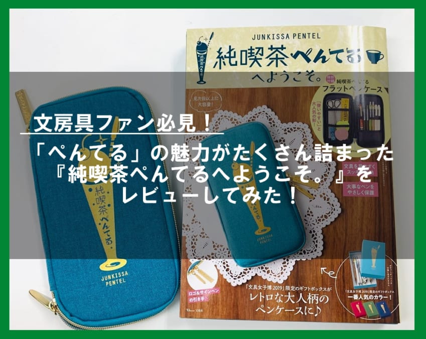 「純喫茶ぺんてる」は老舗文房具メーカーの「ぺんてる」が「文具女子博2019」で展開した限定企画です。ギフトボックスの柄が可愛いとSNSで話題になりました。『純喫茶ぺんてるへようこそ。』の付録には、ギフトボックスで人気だったカラーをモチーフにしたフラットペンケースが付いています。