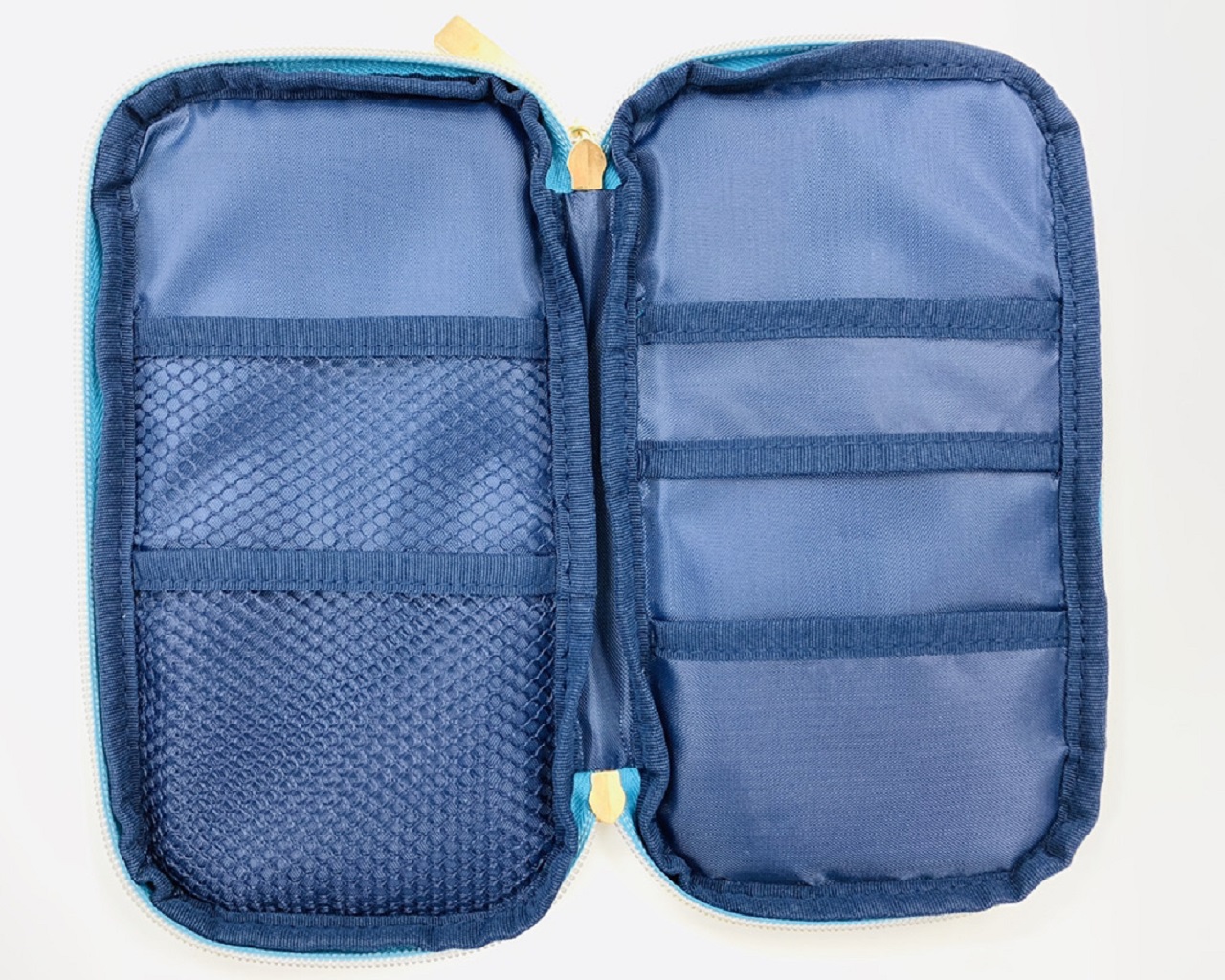 中はこんな感じです。大きさが違うメッシュポケットがあったり、ペンを通して固定できる工夫があったり、使いやすさもバッチリですね。