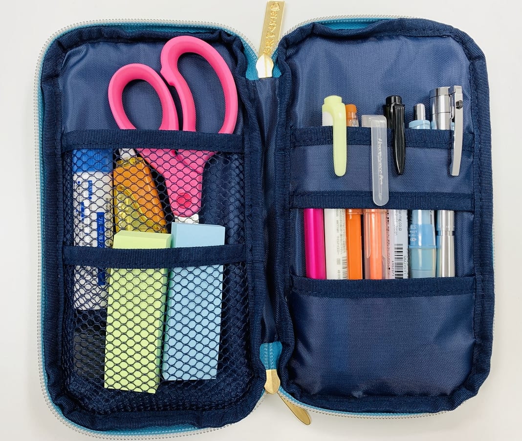 実際に文房具を入れてみました。こんなに文房具を入れても、チャックが閉めやすく、チャックの開け閉め時のストレスはありません。