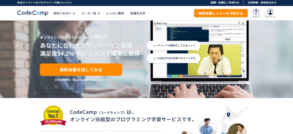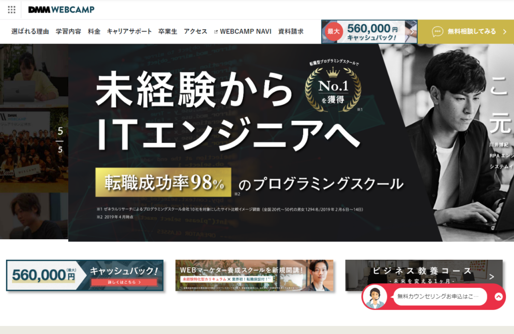 転職率は98%と(2019年4月時点)と圧倒的な転職率を誇り、就職できなかった場合は、全額返金保証(30歳未満限定)が適用されます。オフラインのほかにもオンラインでの学習も可能です。