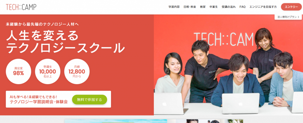 「TECH CAMP」は、実践で使えるプログラミングスキルの習得と、徹底したサポート体制が魅力の対面式(オンラインでの学習も可能)のスクールです。30代の転職に強い点も見逃せません。