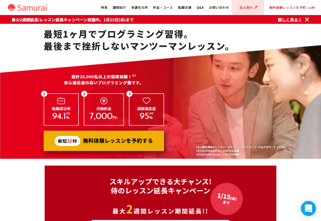 オンラインマンツーマン形式のエンジニアスクール「侍エンジニア塾」には、無料で学習できる転職特化型の「転職コース」があり、転職に成功すれば受講料を支払う必要はありません。