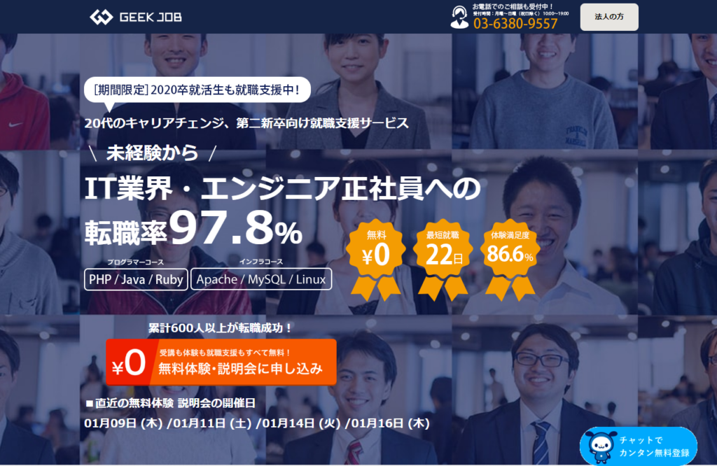 オンライン形式のプログラミングスクール「GEEK JOB」は、プログラミングの学習だけではなく、早期就職を目指す、20代の社会人を対象にした「スピード転職コース」もあります。