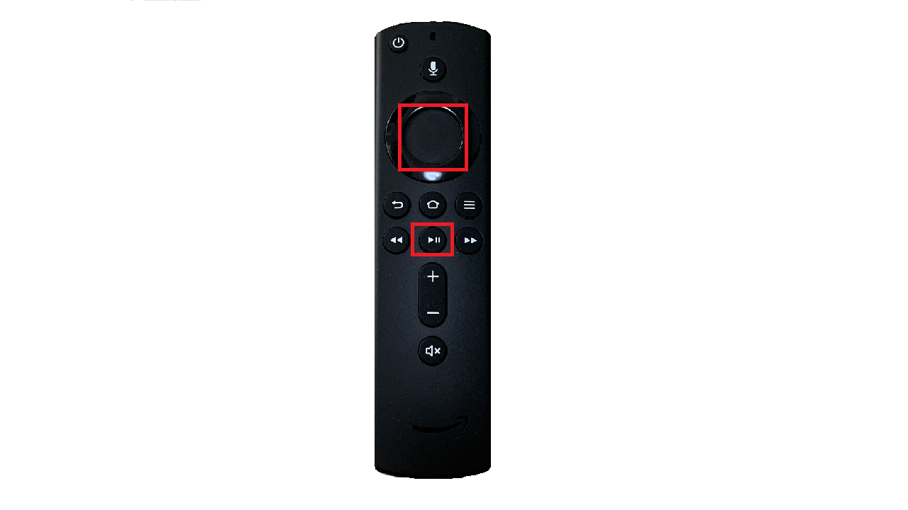 Fire TV Stickを一度再起動してみるのもひとつの手です。赤色で囲っているボタン「選択ボタン」と「再生ボタン」を同時に長押ししてみてください。それで、再起動することができます。