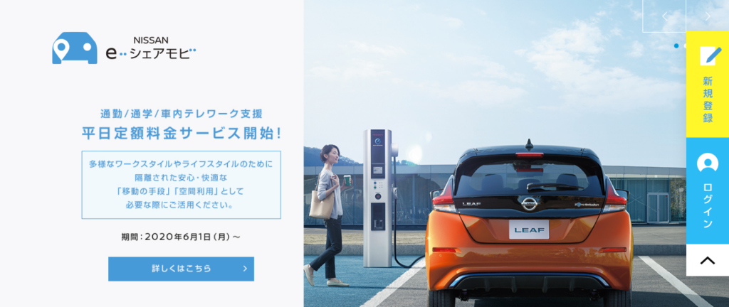 日産が展開するe-シェアモビは、先進技術を搭載した電気自動車「日産リーフ」「ノートe-POWER」「セレナe-POWER」を対象とした、カーシェアサービスです。