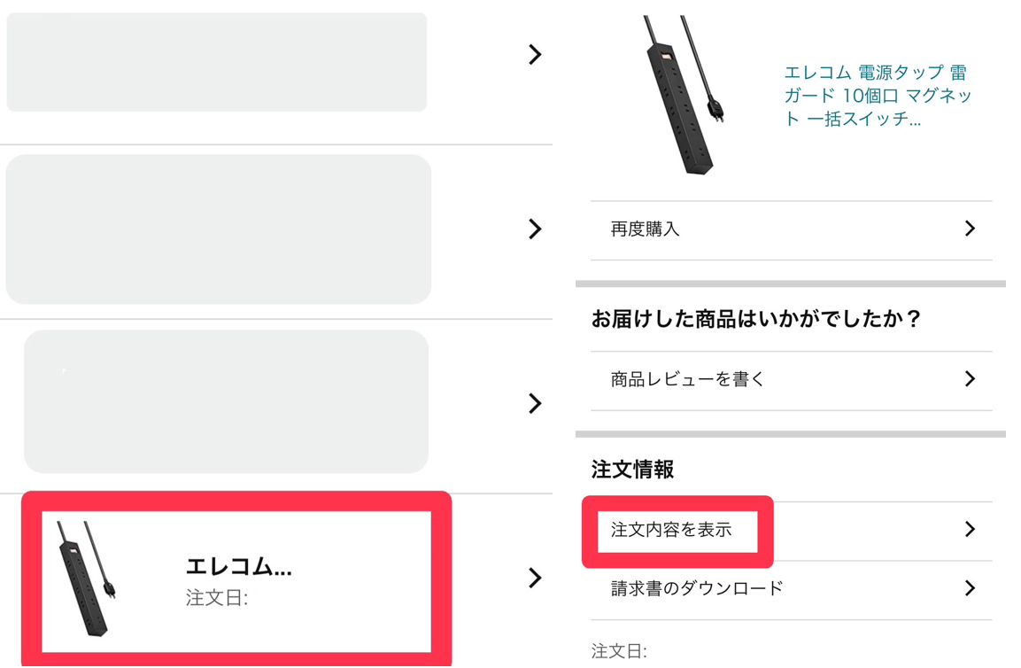 - 領収書を発行したい商品の「注文内容を表示」をタップします。
