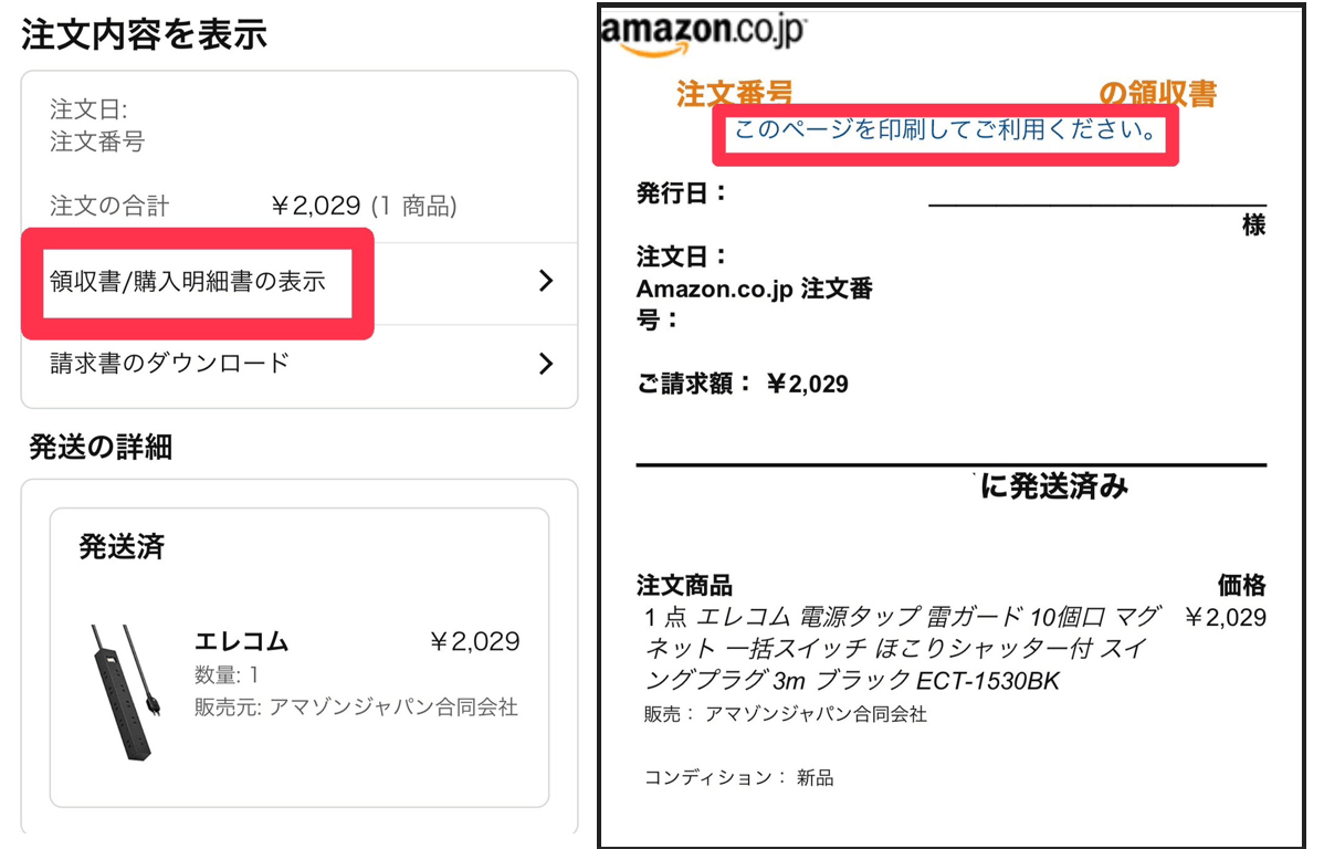 領収書もしくは購入明細書は、AmazonもしくはAmazonマーケットプレイスの出品者が商品を発送した直後から発行可能です。